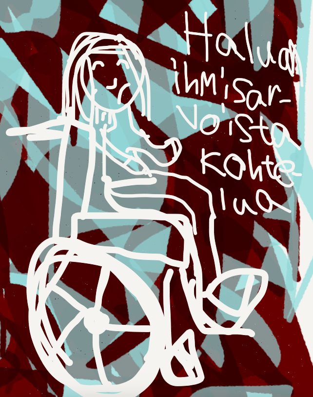 Kohtasin junamatkalla erään vanhemman ihmisen, joka ensin ihmetteli ääneen minun yksin matkustamista ja sitten hän kertoi ymmärtävänsä minua, koska hänkin on ollut vuodepotilaana. Ensinnäkin en ole hoidettava ihminen vaan aikuinen nuori eli voin vallan mainiosti matkustaa yksin, jos koen pärjääväni. Sitä paitsi, vaikka minulla olisi avustaja matkassa toivoisin lähtökohtaisesti, että häntä ei uusissa tilanteissa huomioitaisi. Avustaja vaan mahdollistaa itsenäisen toimintani, eikä hänen tarkoituksena ole ikinä osallistua minun kohtaamisiin. Toiseksikin minulla ei ole kokemusta vuodepotilaana olosta, eikä sitä voi mitenkään verrata elin ikäiseen vammaisuuteen. Tekeekö pyörätuoli ihmisestä jotenkin sairaan. Mielestäni pyörätuoli on vain apuväline, jonka avulla voin liikkua itse kun jalkani eivät kanna. Pyörätuolissa olevan elämä ei ole mitenkään kamalampaa, joten minua ei tarvitse yrittää sääliä tai ymmärtää.